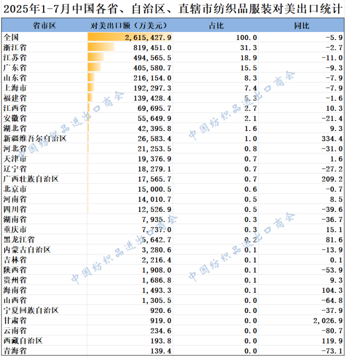 Overview of textile and apparel exports to the United States from key provinces and cities from January to July 2025.Issuing time:2025-08-06 11:04 Overview of textile and apparel exports to the United States from key provinces and cities from January to July 2025. From January to July 2025, China's cumulative textile and apparel exports to the United States reached 26.154 billion USD, a decrease of 5.9% year-on-year. Zhejiang Province, Jiangsu Province, Guangdong Province, Shandong Province, and Shanghai are ranked as the top five provinces and cities in textile and apparel exports to the U.S., accounting for over 80% in total.